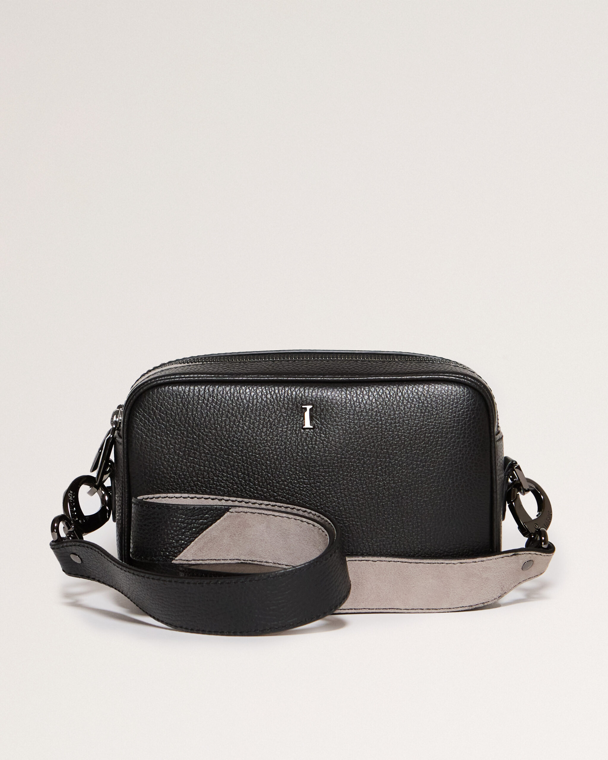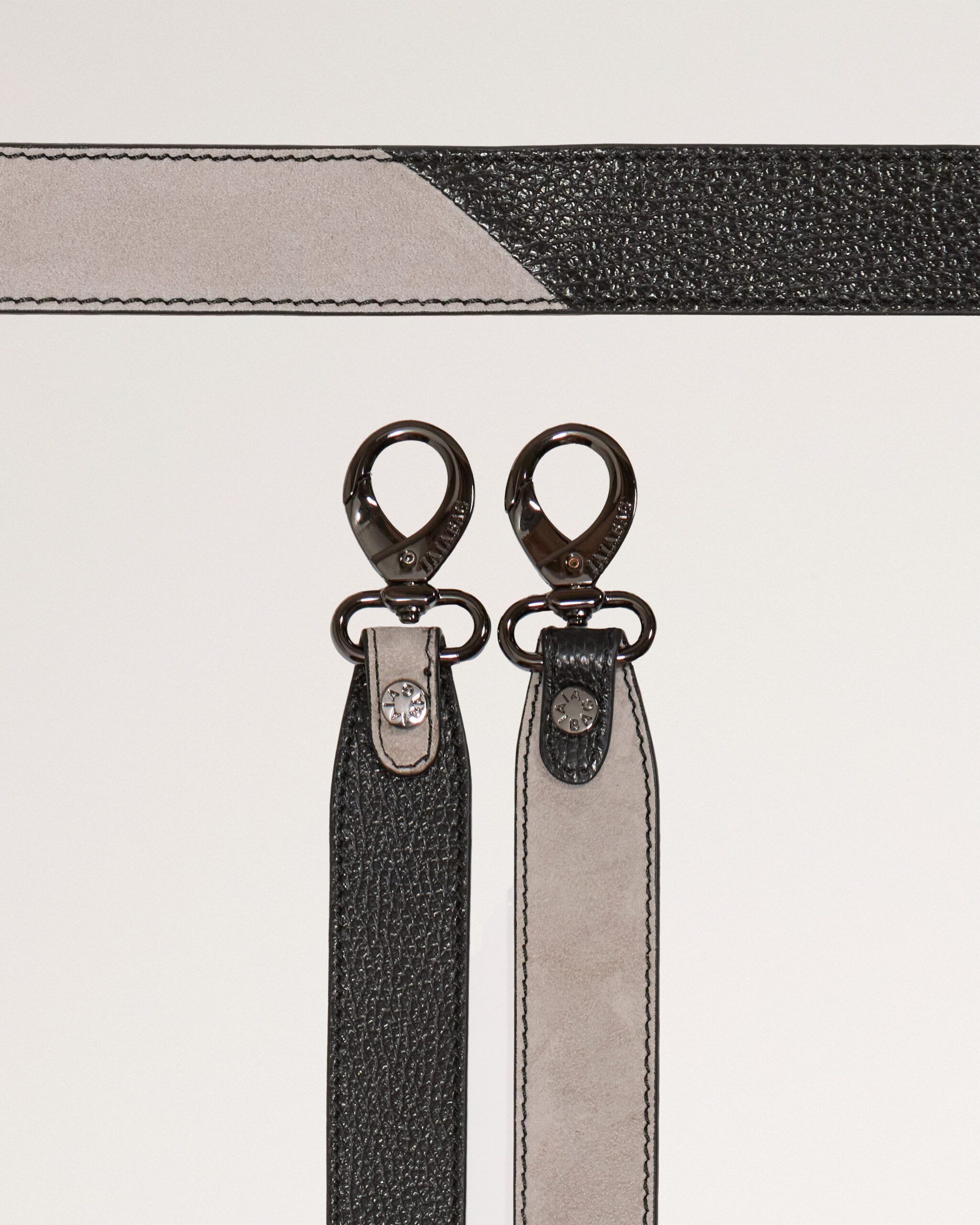 Bebè include una tracolla in pelle bicolore che riprende i colori e i materiali della borsa